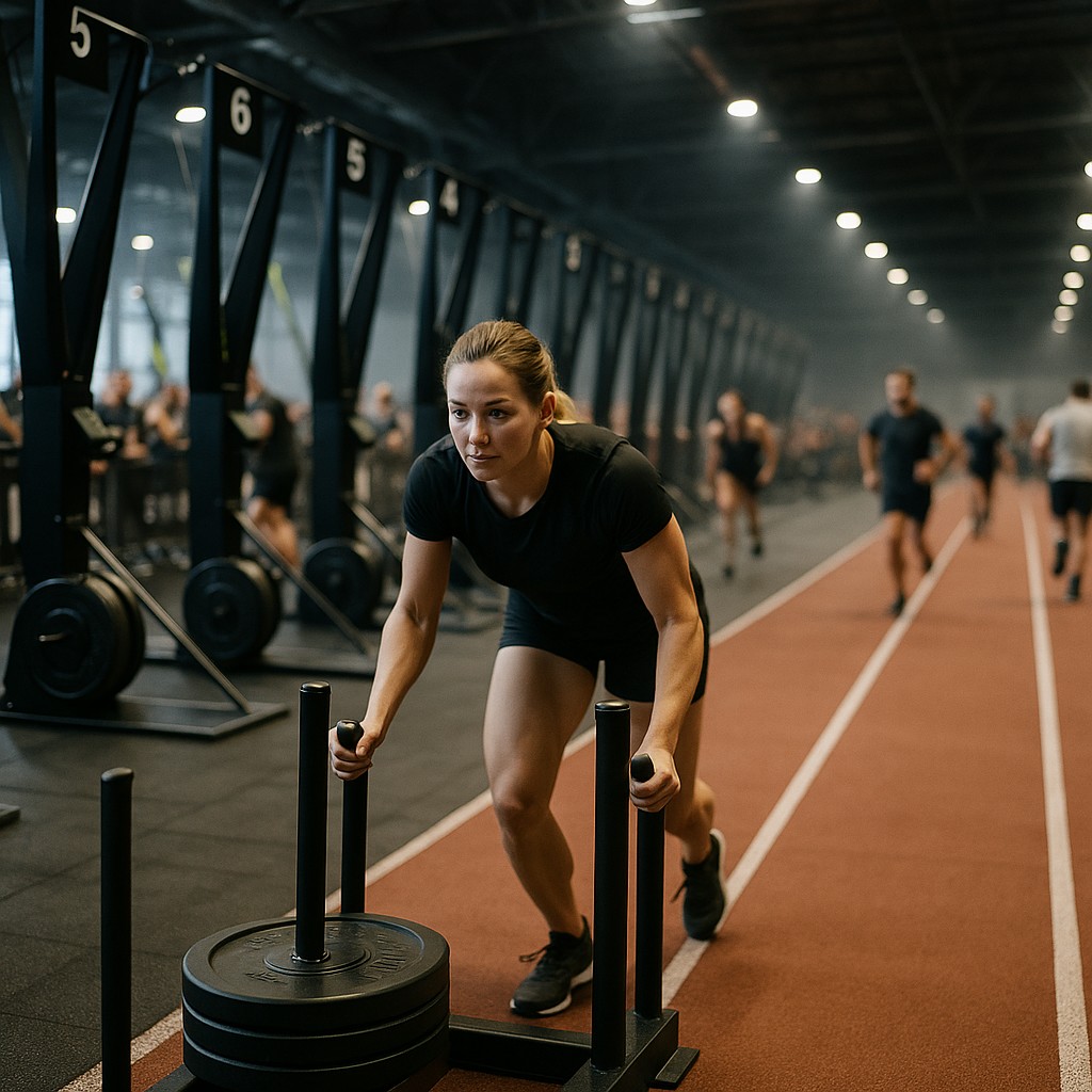 - Sled Push: Druck über Fersen, Spannung im Core, kurze Schritte.